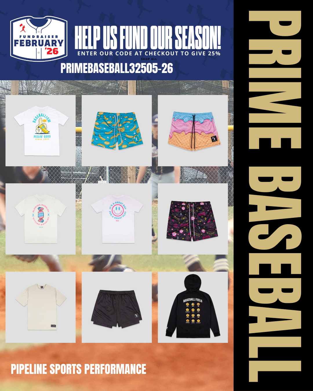 From February 1–28, 25% of every purchase made using our official program code will go directly back to Pipeline Prime Baseball. Funds raised will help support our athletes throughout the season, including travel expenses, tournament opportunities, training equipment, and continued player development.