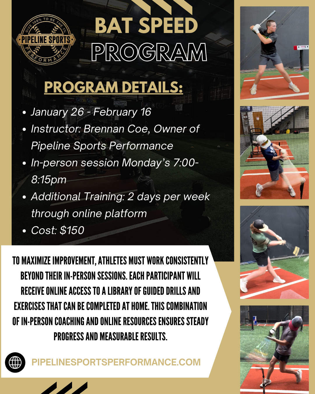 ⚾ Join Pipeline Sports Performance for our Bat Speed Program, led by Brennan Coe, owner and head coach at Pipeline. This program combines in-person coaching with online guided training to maximize bat speed, mechanics, and strength over a four-week period.