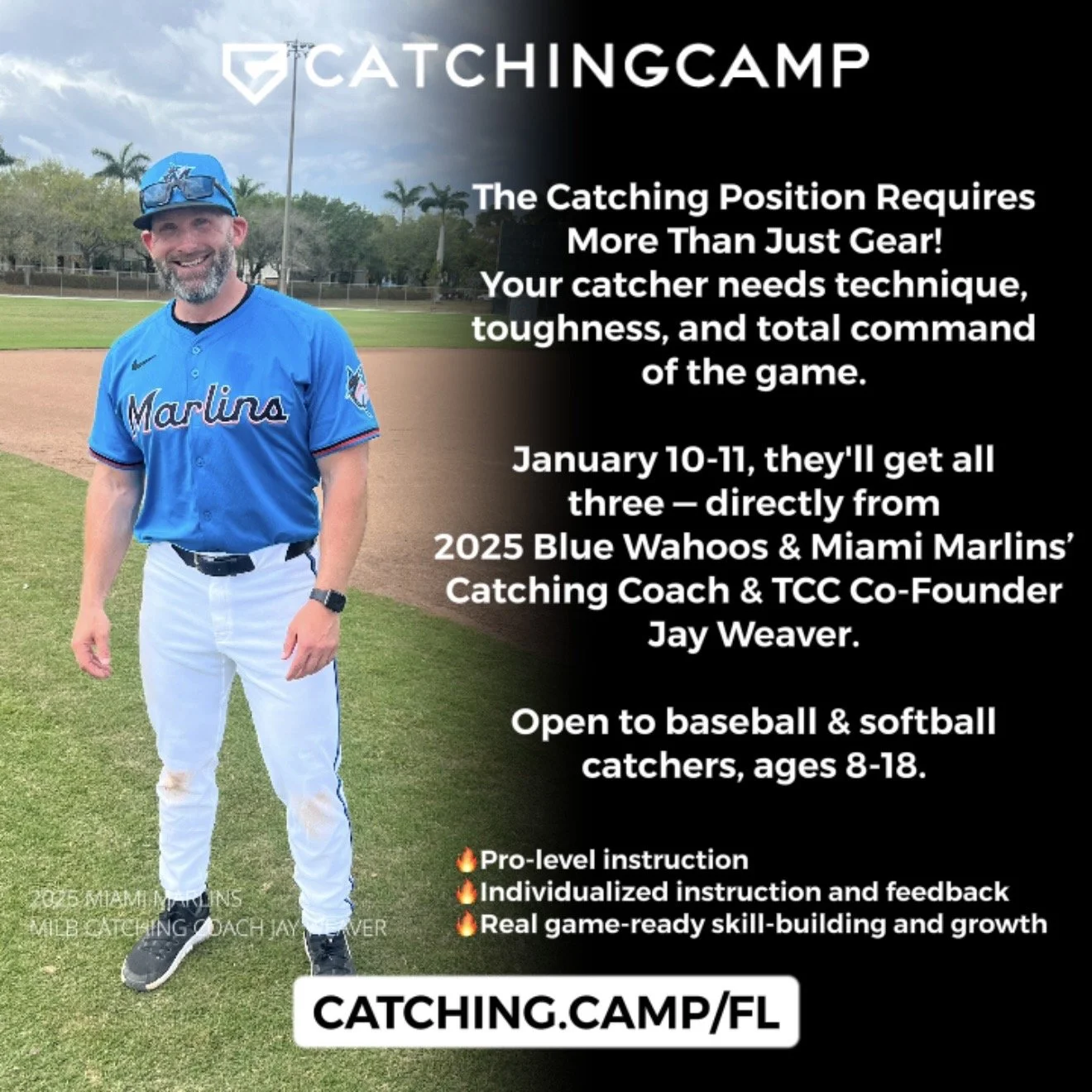 The nationally renowned catching program The Catching Camp will be returning to the great state of FLORIDA January 10-11, 2026. Partnering with Pipeline Sports Performance, 2025 Pensacola Blue Wahoos' Catching Coach Jay Weaver and Catching Camp staff will conduct camps, for both baseball & fast-pitch softball, ages 8-12 and 13-18.